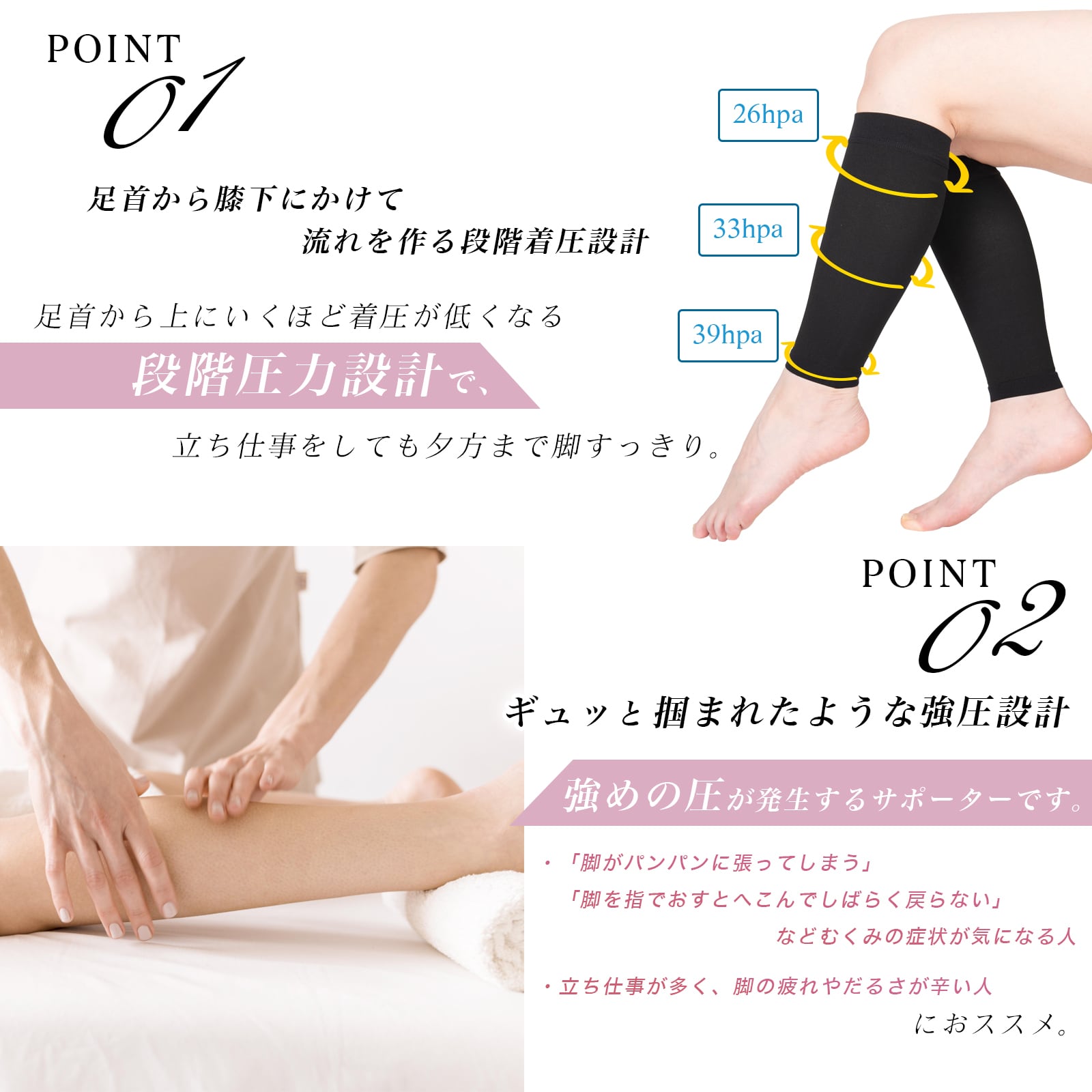 ふくらはぎの筋肉が持つポンプの役割をサポート。血液を心臓に送り返し、マッサージ効果によりこむら返り・夜間頻尿対策にも。